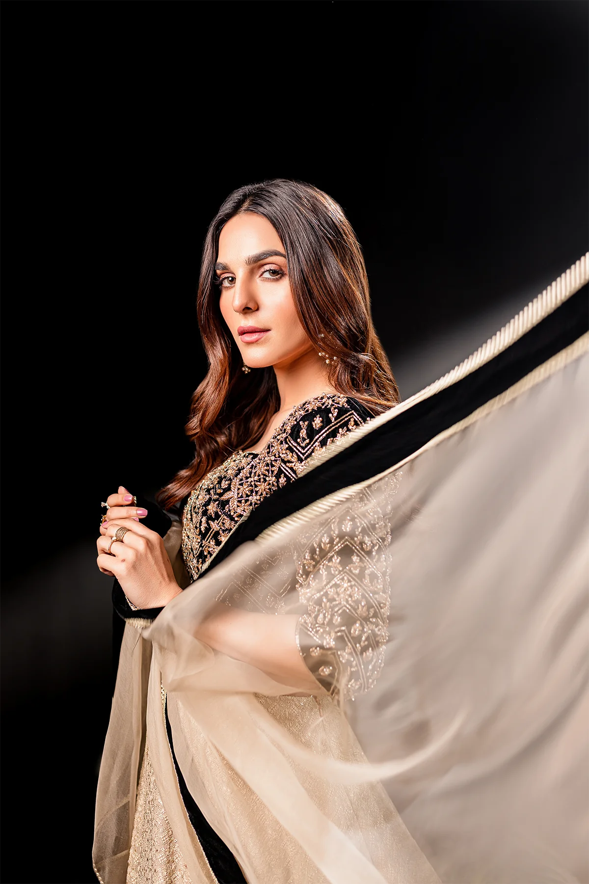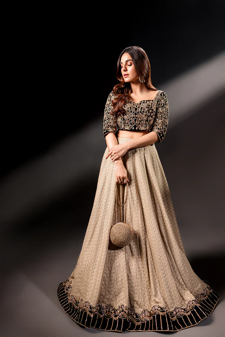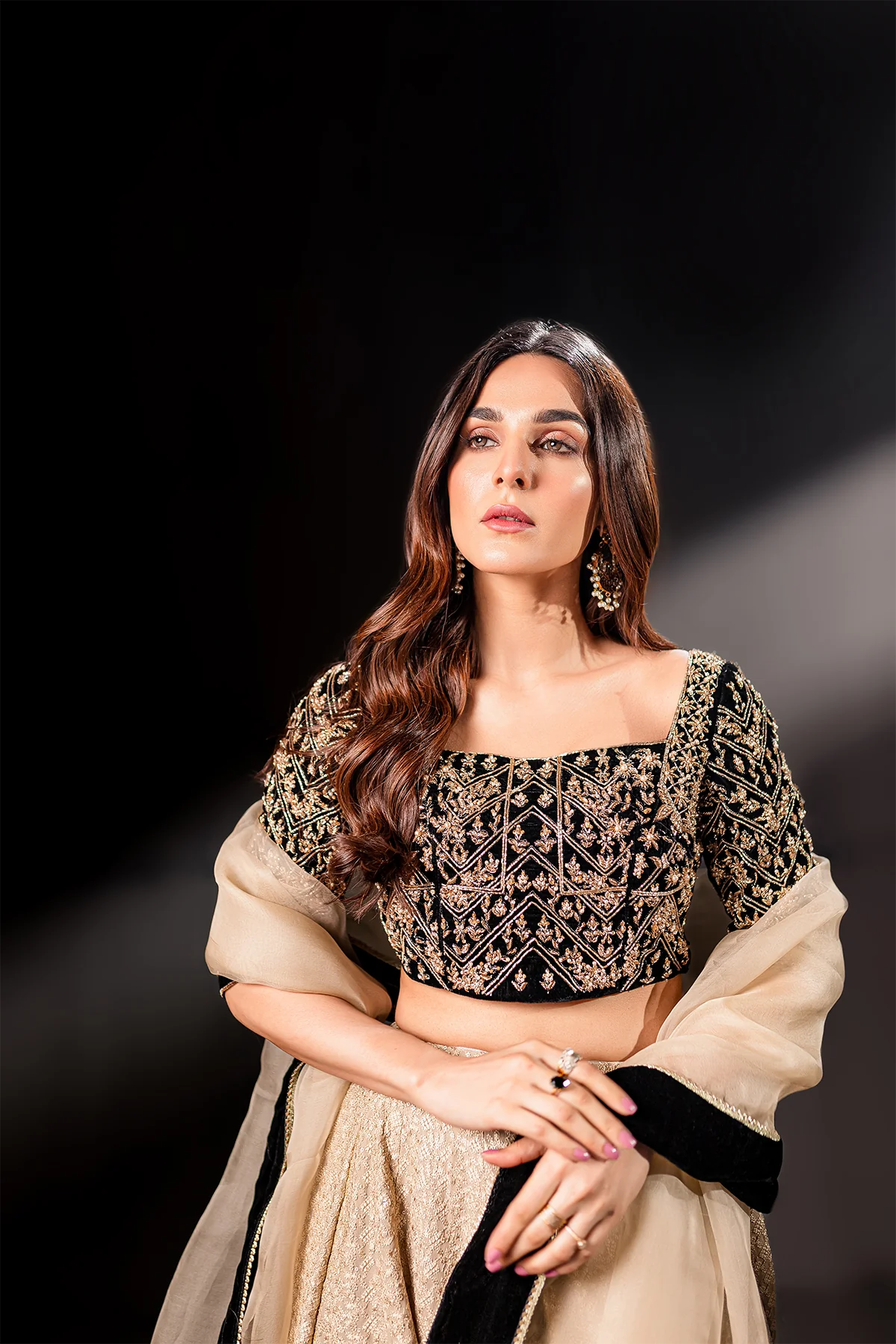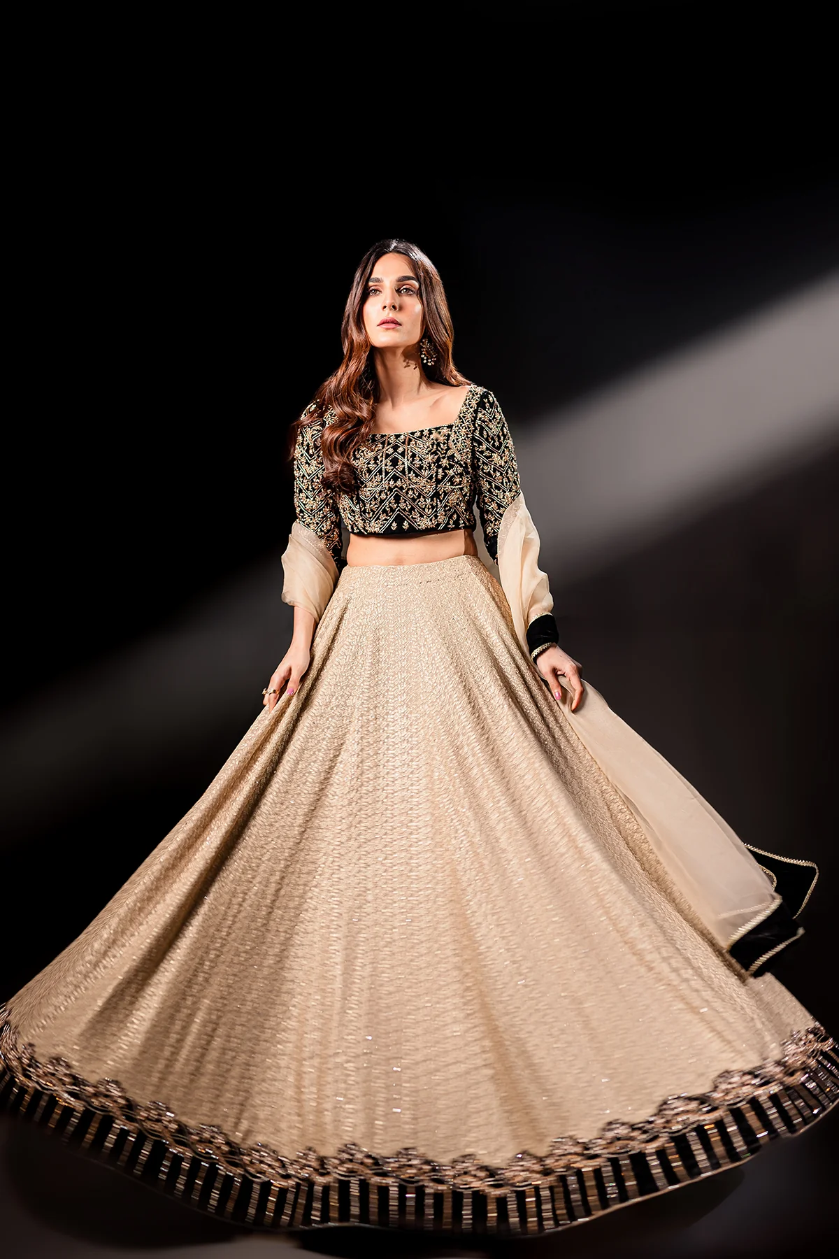 Black square necked velvet choli with Indian sleeves paired with a gold georgette Lehnga. The Lehnga of this outfit has embossed embroidery using silk threads and sequins in shades of gold, with a velvet embellished border. The choli has floral intricate pattern on it and is embellished using zardozi, gold crystals sequins and bugle beads. Paired up with a gold silk organza dupatta having black velvet border all around with gold lace.