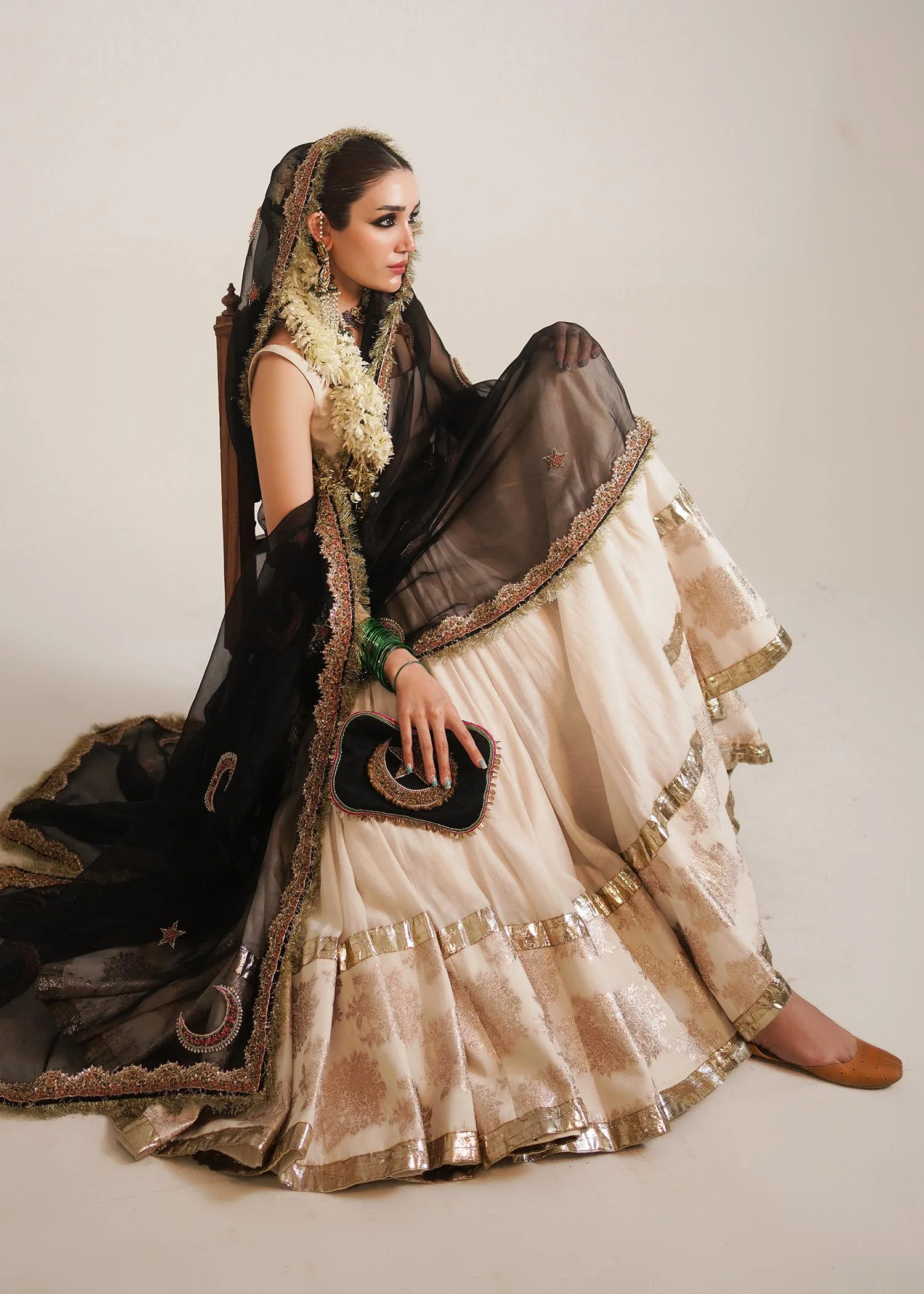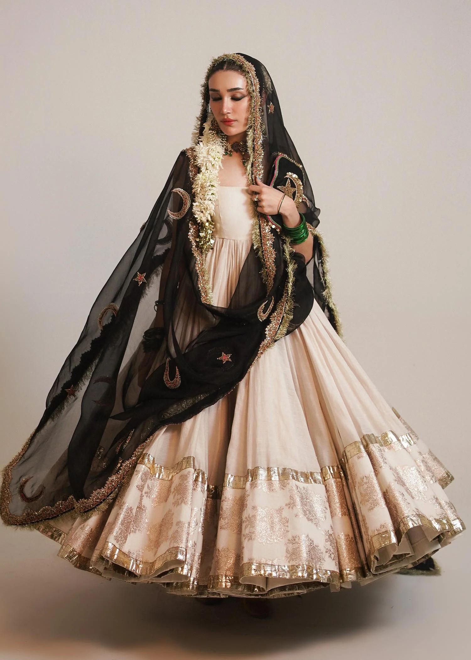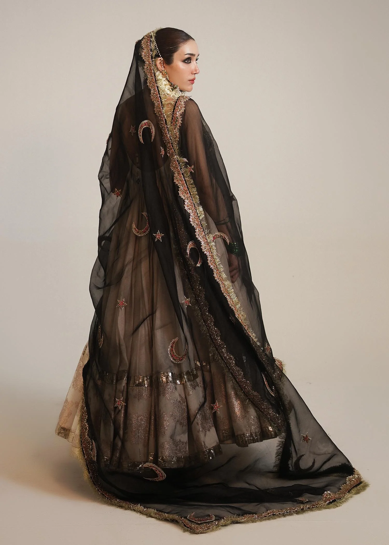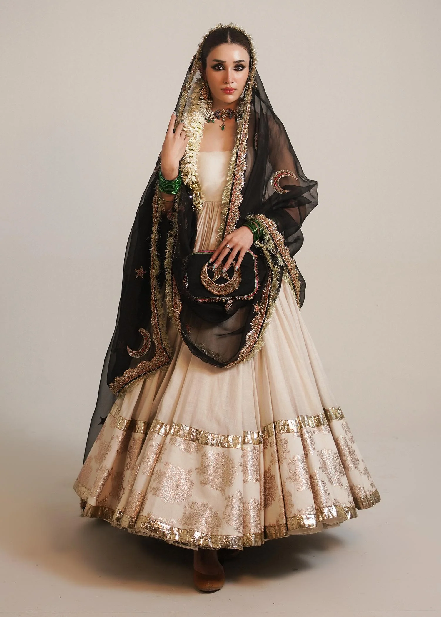 A graceful opulent chanderi silk white floor length peshwaz with pretty organza border enhanced with lappa on both sides of hem. It is paired with plain chanderi silk chooridar. Creating an alluring aura is 4 yards black organza dupatta with thin elegant border and motifs of star and moon in multi-colored and gold naqshi, cutdana and bead adda work to enhance this attire. Light gold Kiran on all borders create a nostalgic memory of the festivity.
