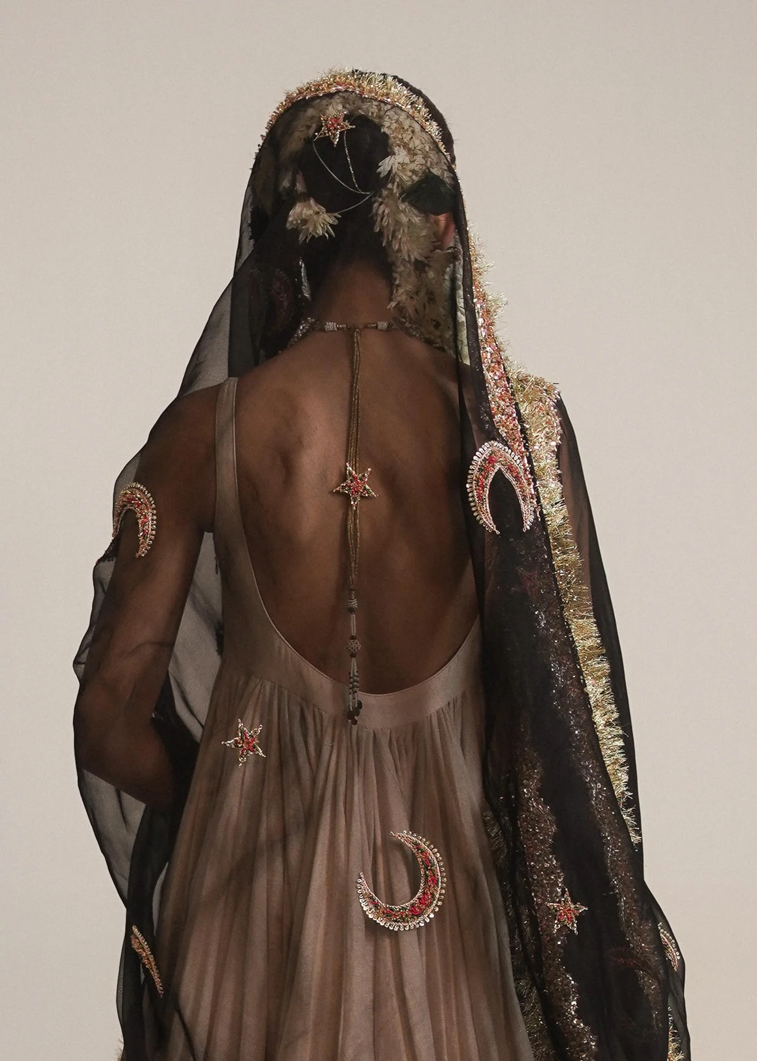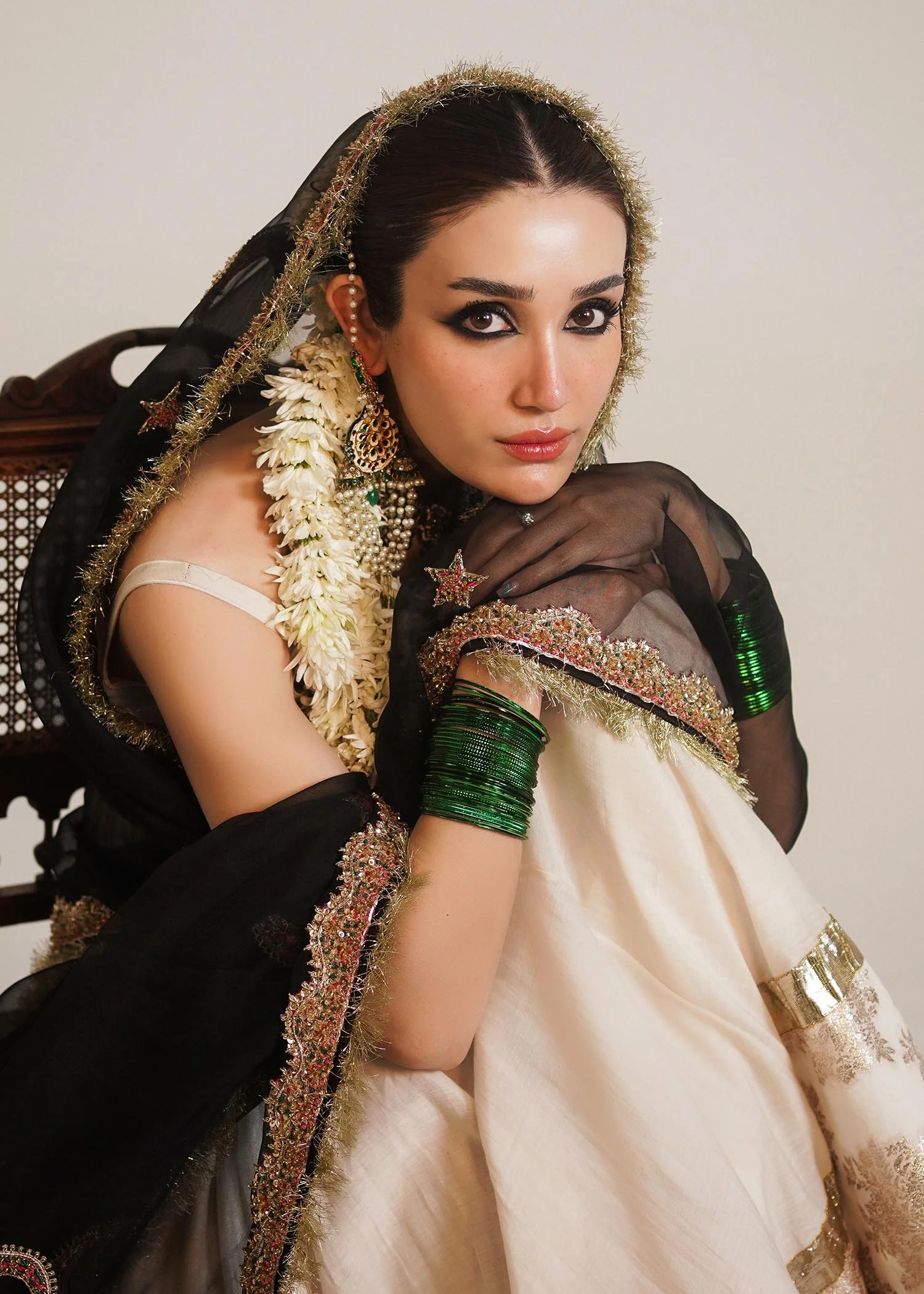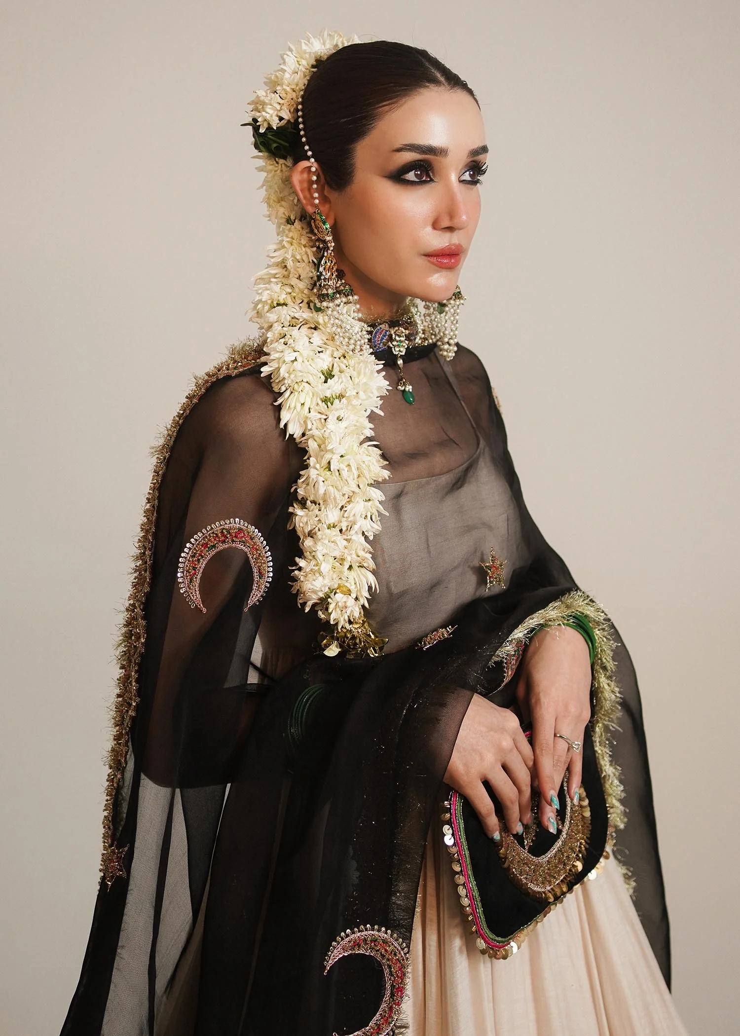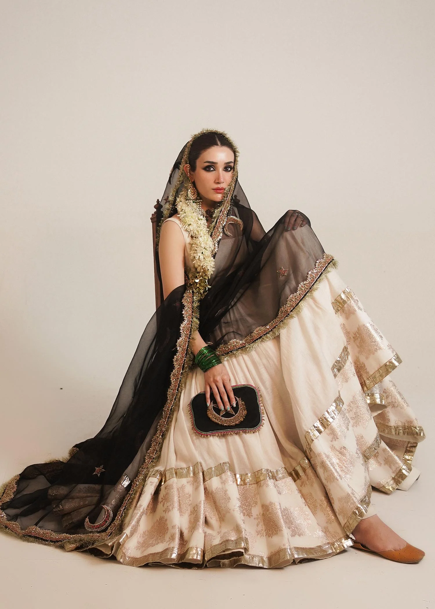 A graceful opulent chanderi silk white floor length peshwaz with pretty organza border enhanced with lappa on both sides of hem. It is paired with plain chanderi silk chooridar. Creating an alluring aura is 4 yards black organza dupatta with thin elegant border and motifs of star and moon in multi-colored and gold naqshi, cutdana and bead adda work to enhance this attire. Light gold Kiran on all borders create a nostalgic memory of the festivity.