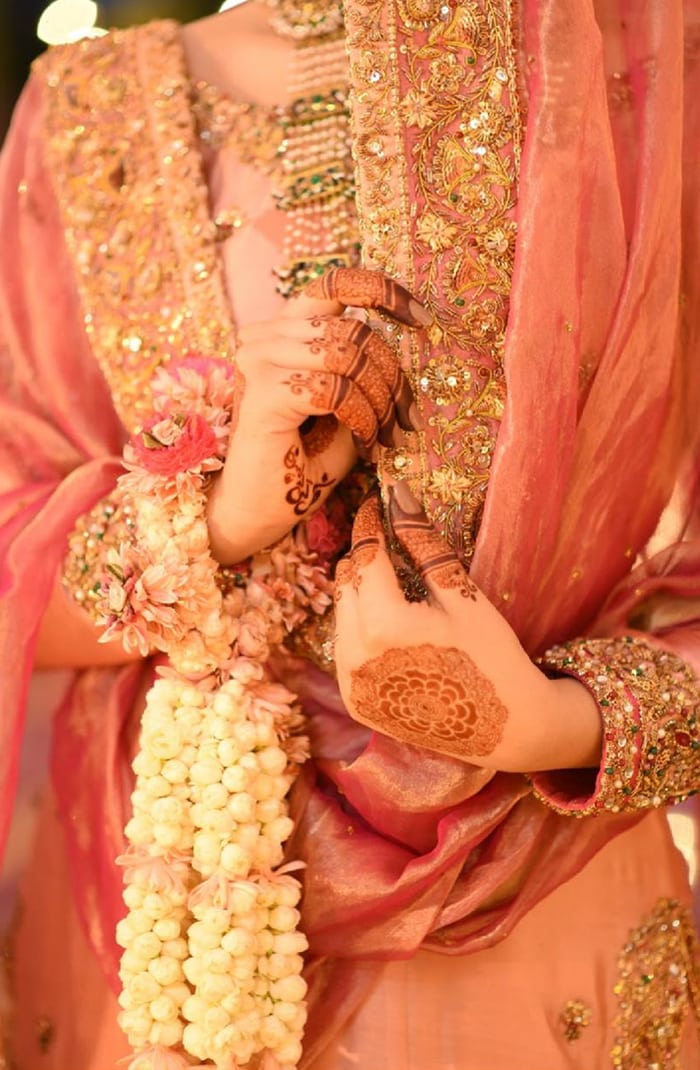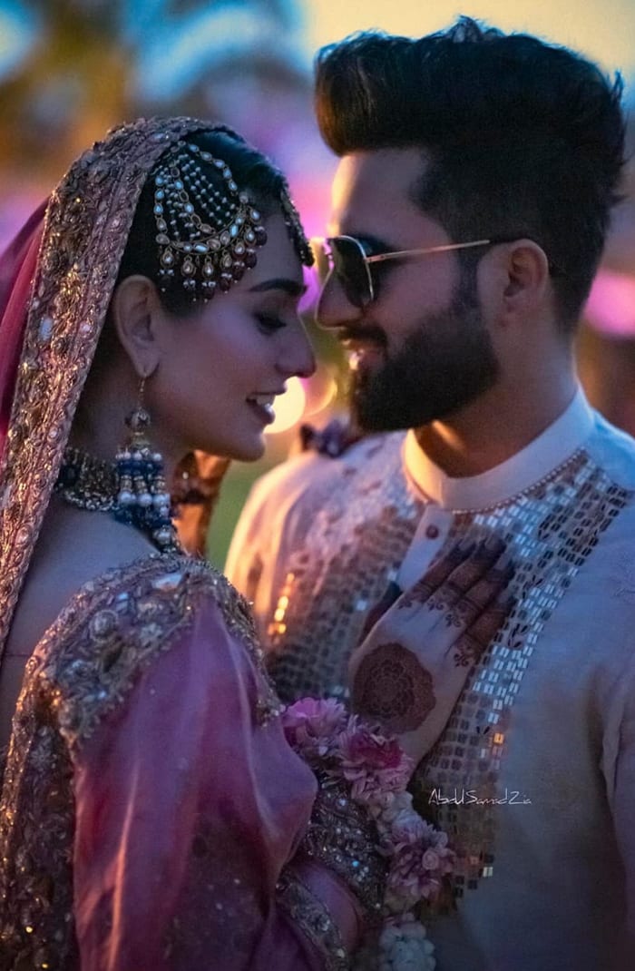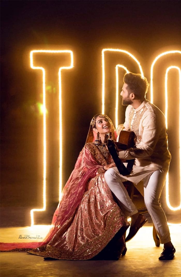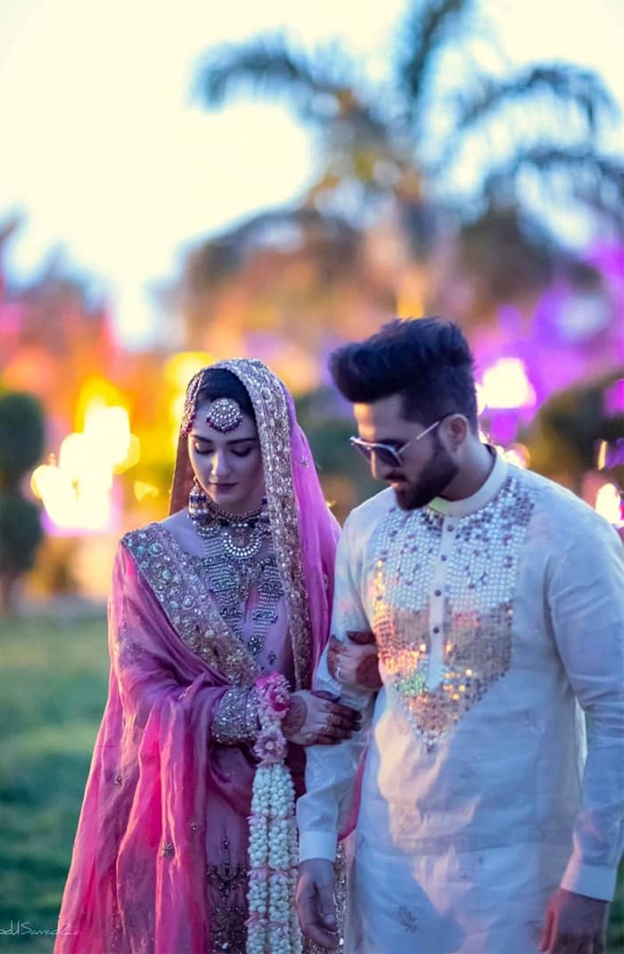 Sarah Khan looks ethereal in ‘Mah e Falak,’ A rose pink short shirt with a spray of floral motifs scattered throughout the shirt. Embellished with semi-precious stones and dabka work to enhance the beauty of this traditional ensemble.