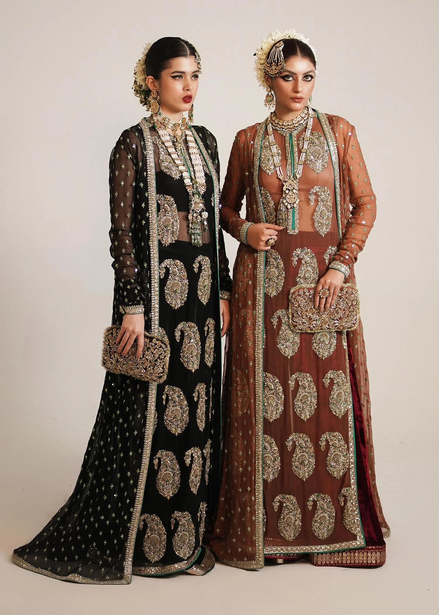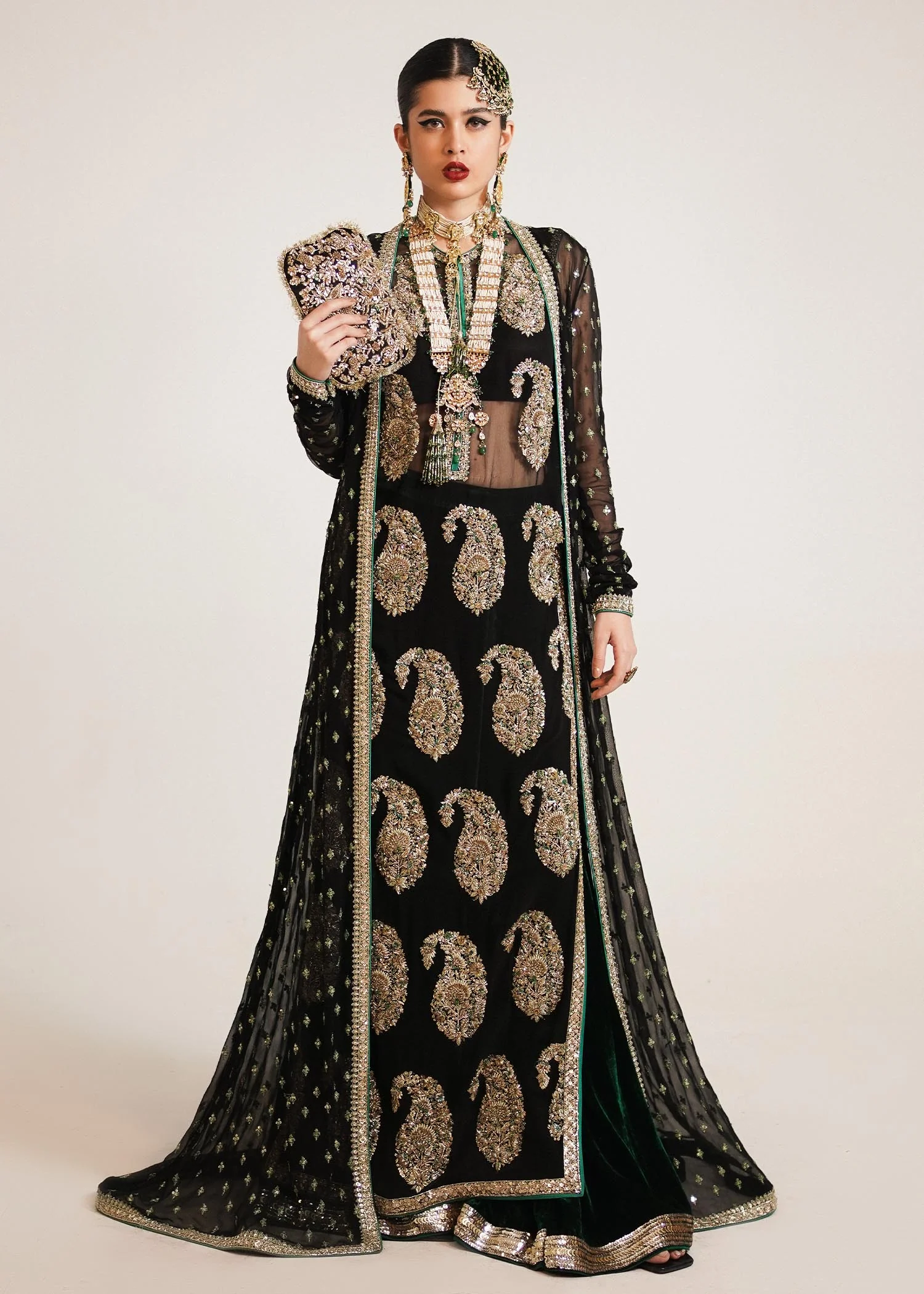 Exuding elegance is this pretty murky black chiffon floor length shirt intricately embellished with gold adda work of naqshi, dabka, sequins and multicolored cutdana paired with a beautiful chiffon gown adorning light chatta of sequins. This chic and sleek outfit comes with a plain satin silk bustier and velvet palazzo pants finished beautifully with a lappa at the hem.