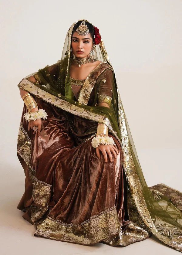 An ethnic nostalgic feel of this lilac velvet gharara and velvet shirt is all that you want this wedding season. This ethnic cut has a modern naqshi and grayish gold sequin detailed border at the hem of gharara and the neckline of the shirt. Dupatta with florescent green adds a blast of color with thick gray sequined borders resembling hem of gharara and motifs at corners of borders adds a oomph factor to this minimalistic ensemble.